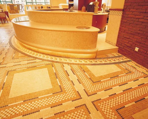 看,這是威尼斯酒店的餐廳地面,全部采用石材馬賽克鋪飾。如果不經(jīng)意看去,竟像是編織好的地毯般柔軟。圖案簡單卻不失藝術欣賞價值,色彩雖只有黑色白色黃色卻不單調(diào)乏味,形狀雖然只是平常正方形或長方形卻在不斷的重復中展現(xiàn)了力量美和方正美。