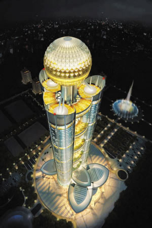 華西增地空中新農(nóng)村大樓主體高度為328米,世界排名第15位,全國排名第8位,大樓共74層,有5個(gè)以金銀銅鐵錫裝飾的空中花園,和以金木水火土五行為主題的五層會(huì)所,整棟樓呈“三足鼎立”形狀,中央頂部設(shè)有一個(gè)直徑50米的球體,就像一顆璀璨的明珠。與會(huì)專家認(rèn)為,該建筑在設(shè)計(jì)上充分演繹了中國傳統(tǒng)文化的內(nèi)涵,以及華西村團(tuán)結(jié)和諧、共同致富的精神;在建設(shè)上運(yùn)用現(xiàn)代先進(jìn)技術(shù)和建筑材料,實(shí)現(xiàn)了綠色、節(jié)能、環(huán)保,成為了華西村重要的地標(biāo)性建筑。