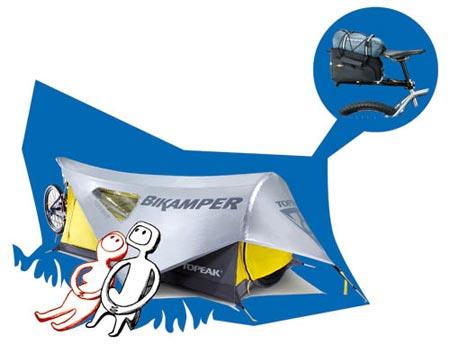 改裝版的單車帳篷因為使露營生活輕便如常而成為本年度最富創(chuàng)意的休閑生活設計作品。單車帳篷只憑一輛26型登山單車就可獨自撐起,不需另假他人幫忙;整個帳篷收納起來只有一個睡袋的大小,1.2千克的重量放在腳踏車上幾乎可以忽略不計;它的材質具備防水、耐久、防風的特點,符合一切帳篷所要求的高標準,同時它也為富有情趣的露營者設計了一個通風的窗戶,夜晚降臨時透過窗戶看滿天的星斗。