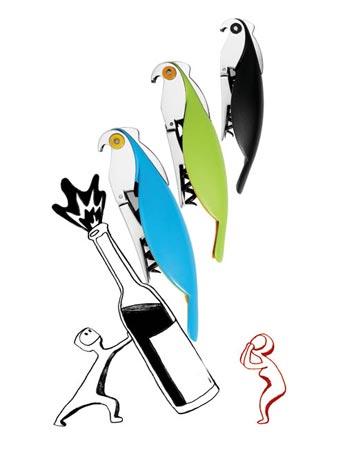 Aleandro Mendini的Aa G.開罐器,自從1994年推出,便一直是Alei暢銷排行榜冠軍,Mendini本人其實不如他的設計作品輕松,他曾經指導和發(fā)行設計和建筑雜志,有大量的設計資料和完整的設計理論基礎,但他常將嚴肅的設計意識設計披上愉快詼諧的外衣。Mendini的設計總以一種感性的角度出發(fā),作品總有人物或是動物的隱喻。今年新作品中,他用各種顏色造型的鸚鵡為兩用開瓶器,鸚鵡的嘴是開啤酒等瓶蓋,而開啟紅酒木塞的栓子巧妙藏在肚子里。