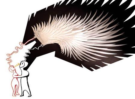 Tord Boontje是目前炙手可熱的英國設計師,他最著名的作品—仲夏夜之燈(Midsummer Light)以計算機隨機切割如剪紙般的圖案,不同顏色的剪紙層層覆蓋,花團錦簇中,灑落點點光影,其浪漫的設計風格風靡歐洲。Tord Boontje的作品一直圍繞“自然”的主題,但今年的最新作品不再采用他最為擅長的花草語言,這盞2005年的吊燈被命名為Icarus,取自希臘神話。在傳說中工匠 Daedalus為兒子Icarus造了一雙蠟造的翅膀,他駕駛飛行羽翼成功試飛,受到內心深處飛向更高處的欲望驅使,他振翅飛向太陽,因羽毛為高溫融化而葬身大海。