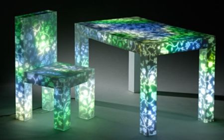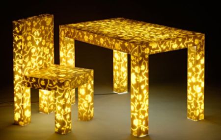 這款造型樸實(shí)、長(zhǎng)相中規(guī)中矩的桌椅乍看起來(lái)并不起眼,可是在接通電源之后,整個(gè)桌椅都會(huì)泛起柔和的光,表面還會(huì)顯露出各色的碎花花紋,顯得晶瑩剔透,十分美觀。