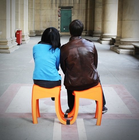 微微翹起的椅腳,像是一只延伸出去的手,邀請(qǐng)大家入座。暗藏玄機(jī)的結(jié)構(gòu)設(shè)計(jì),讓最先入座的一方感受到驚奇,進(jìn)而邀請(qǐng)另一方加入,無論肩碰肩、背靠背,在兩人間都能形成一道親密的弧線,訴說著一種趣味的、互動(dòng)的人際關(guān)系。椅子的斜靠設(shè)計(jì)可以讓背靠背的兩人更加貼近。