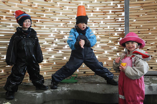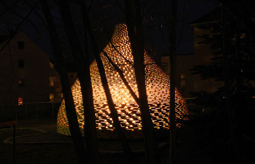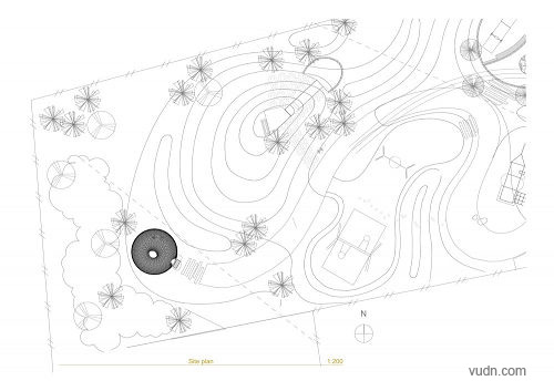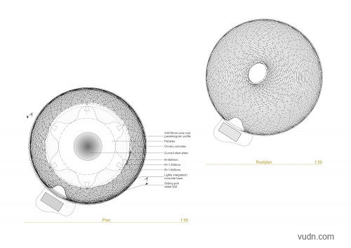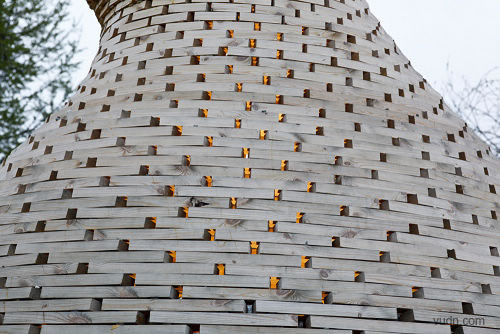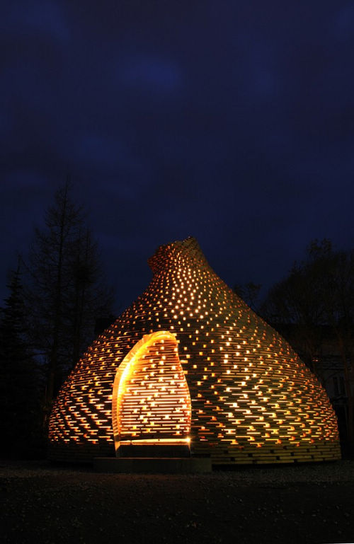 建筑的設(shè)計(jì)以短木件為基礎(chǔ)。這個(gè)建筑的設(shè)計(jì)靈感來(lái)源于挪威的一個(gè)草坪小屋和舊式的原木建筑,它的尺寸為5.2x4.5米。木制結(jié)構(gòu)由80個(gè)圈組成,每個(gè)圈由28片松木構(gòu)成,松木與松木之間形成了自然的縫隙,自然的光線透過(guò)這些縫隙進(jìn)入到空間內(nèi)部,整個(gè)的木制結(jié)構(gòu)看起來(lái)像是一個(gè)煙囪。戶外壁爐有一個(gè)雙層的曲線形滑動(dòng)門。