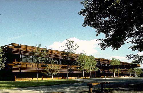 Deere West辦公大樓 三層高的鋼結(jié)構(gòu)附加部分由一座覆蓋玻璃的長鋼架橋和七層高的公司總部大樓(鋼結(jié)構(gòu),由埃羅·沙里寧設(shè)計(jì),1964年建成)連接,在大樓內(nèi)部有一個(gè)面積達(dá)1/4英畝的玻璃頂多層花園,該花園被作為“室外”餐飲空間;一個(gè)自助餐廳和其他的用餐地點(diǎn)也被安排在附近。
