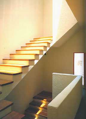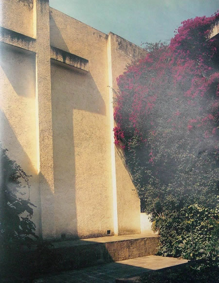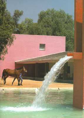 各種色彩濃烈鮮艷的墻體的運(yùn)用是巴拉干設(shè)計(jì)中鮮明的個(gè)人特色,后來也成為了墨西哥建筑的重要設(shè)計(jì)元素。在巴拉干游歷歐洲的時(shí)候曾深深的被摩洛哥那種獨(dú)特的地中海式氣候下濃烈的色彩風(fēng)格所打動(dòng)。他發(fā)現(xiàn)這里的氣候與風(fēng)景是那么的和諧。在回到墨西哥之后他便開始關(guān)注墨西哥民居中絢爛的色彩,并將其運(yùn)用到了自己的眾多作品當(dāng)中。這些色彩來自于墨西哥傳統(tǒng)而純凈的色彩?!斑@種彩色的涂料并非來自于現(xiàn)代的涂料,而是墨西哥市場(chǎng)上到處可見的自然成分染料。這種染料是用花粉和蝸牛殼粉混合以后制成的,常年不會(huì)褪色。你可以看出他常用那種粉紅色的墻,其實(shí)邊上經(jīng)常有一叢繁盛的同樣顏色的花木。這是墨西哥的國花,墻的顏色就來自這些花。但是在早期,巴拉干只用紅黃藍(lán)三個(gè)原色。后來他認(rèn)識(shí)了一位畫家,也許是rivera,然后他就開始自由使用色彩了?!雹?巴拉干對(duì)色彩的濃厚興趣使得他不斷在自己的設(shè)計(jì)作品中嘗試著各種色彩的組合。這也許并不是他對(duì)色彩可意的研究而是一種體驗(yàn)。這種體驗(yàn)使他能夠極好的駕御各種艷麗的色彩,使幾何化的簡單構(gòu)筑物透出絲絲溫情,并用色彩塑造空間給空間加上魔幻詩意的效果。他的色彩實(shí)際上是在毫無羈絆的表達(dá)著作者的各種情感與精神。