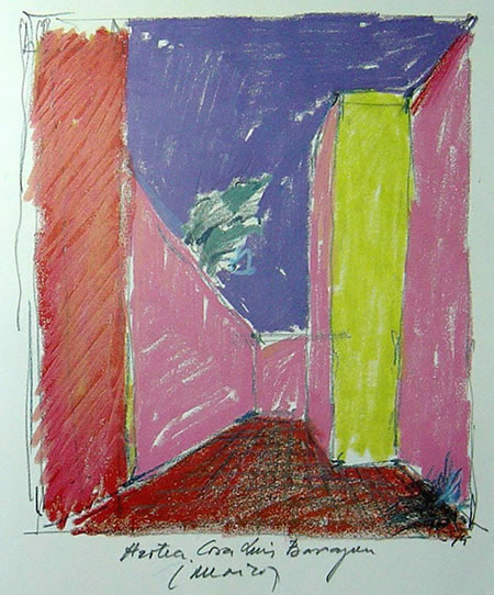 各種色彩濃烈鮮艷的墻體的運(yùn)用是巴拉干設(shè)計(jì)中鮮明的個(gè)人特色,后來也成為了墨西哥建筑的重要設(shè)計(jì)元素。在巴拉干游歷歐洲的時(shí)候曾深深的被摩洛哥那種獨(dú)特的地中海式氣候下濃烈的色彩風(fēng)格所打動(dòng)。他發(fā)現(xiàn)這里的氣候與風(fēng)景是那么的和諧。在回到墨西哥之后他便開始關(guān)注墨西哥民居中絢爛的色彩,并將其運(yùn)用到了自己的眾多作品當(dāng)中。這些色彩來自于墨西哥傳統(tǒng)而純凈的色彩?!斑@種彩色的涂料并非來自于現(xiàn)代的涂料,而是墨西哥市場(chǎng)上到處可見的自然成分染料。這種染料是用花粉和蝸牛殼粉混合以后制成的,常年不會(huì)褪色。你可以看出他常用那種粉紅色的墻,其實(shí)邊上經(jīng)常有一叢繁盛的同樣顏色的花木。這是墨西哥的國花,墻的顏色就來自這些花。但是在早期,巴拉干只用紅黃藍(lán)三個(gè)原色。后來他認(rèn)識(shí)了一位畫家,也許是rivera,然后他就開始自由使用色彩了?!卑屠蓪?duì)色彩的濃厚興趣使得他不斷在自己的設(shè)計(jì)作品中嘗試著各種色彩的組合。(如圖)這也許并不是他對(duì)色彩可意的研究而是一種體驗(yàn)。這種體驗(yàn)使他能夠極好的駕御各種艷麗的色彩,使幾何化的簡單構(gòu)筑物透出絲絲溫情,并用色彩塑造空間給空間加上魔幻詩意的效果。他的色彩實(shí)際上是在毫無羈絆的表達(dá)著作者的各種情感與精神。