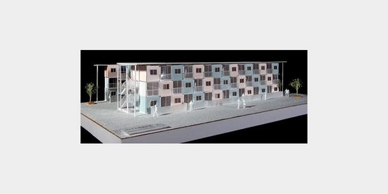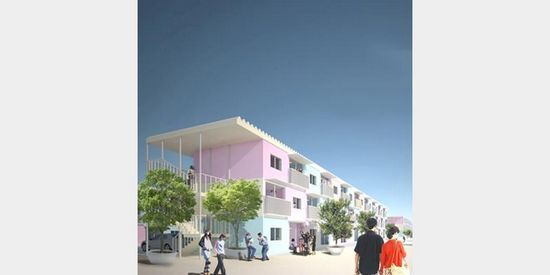 坂茂的建筑事務(wù)所運(yùn)用海運(yùn)集裝箱快速地裝配這種住房。這個(gè)設(shè)計(jì)方案是在一個(gè)棋盤結(jié)構(gòu)內(nèi)放置3層集裝箱,并在集裝箱內(nèi)安排生活空間。