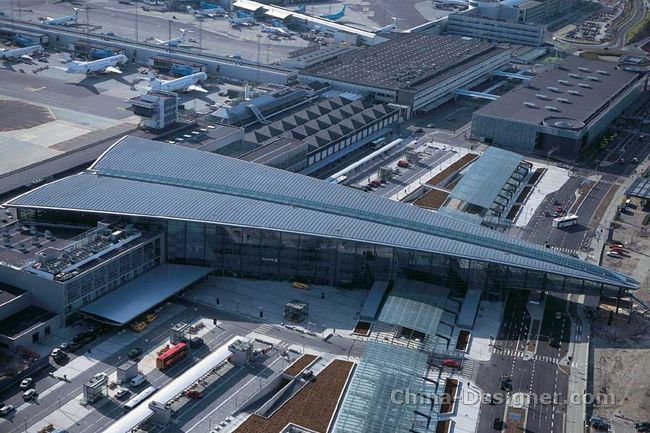 在占地面積上屬于中型那種。鋪青灰色的花崗巖地磚,冷峻而高貴。而在主入口的商業(yè)區(qū),則用堅硬的木地板,登機口附近的地面是青灰色的花崗巖,候機休息區(qū)是在花崗巖地磚上鋪灰藍色的薄地毯,商業(yè)部分是硬木地板,深棕色,功能區(qū)用地面材料分劃得清清楚楚。機場的主要家具設計是用鋼管結(jié)構(gòu),候機處用的是鋼管結(jié)構(gòu)、上面是紡織品的軟面椅子,人機工學處理得幾乎無懈可擊,怎么坐怎么舒服。整個機場內(nèi)部控制鋼管家具、青灰色花崗巖地磚、極為理性化的空間分隔原則,全部用模數(shù)單位統(tǒng)籌,電話亭一類深藍色,電話也用鋼管環(huán)繞起來,形成一個鋼管系列感,視覺上統(tǒng)一,也覺得是機場的基本設計元素之一。所有平面標志統(tǒng)一用無飾線體,標志極為清晰,基本是醒目的黃色的。公共服務區(qū)、商業(yè)區(qū)的頂部是圓形的燈筒,解決冬天昏暗時分的壓抑感。信息電視屏幕從天花板上懸吊下來,角度很合適,到處都有,了解進港和出港的航班極為方便。垃圾筒全部是圓柱型的不銹鋼桶,有些轉(zhuǎn)角部位有全部是柔軟的紡織品、暖色調(diào)的紡織品的沙發(fā),讓人候機休息。凡是狹窄的甬道,就在兩邊墻上掛現(xiàn)代藝術作品,好像畫廊一樣,毫不枯燥。其中波普、構(gòu)成主義的作品為主,一方面是有趣味感,一方面是比機場跑道較非主題性,這樣無需駐足觀看。那些狹窄的通道的椅子更加講究,是用鋼管坐結(jié)構(gòu),上部是樺木、柚木的,加上深黑色的軟墊,旁邊是干凈的不銹鋼垃圾桶,一種非常洗練的感覺。