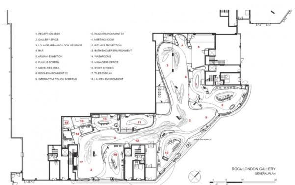 Roca意圖將展覽館打造成舉辦展覽、演講、會議及其他活動的場所。水的流動是Roca倫敦展覽館的絕對主導(dǎo)主題,因此室外與室內(nèi)空間都遵循流水式的意象而設(shè)計。