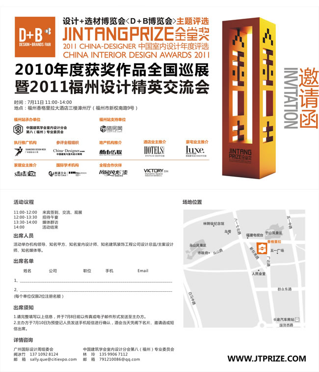 2010年度獲獎作品全國巡展暨2011福州設(shè)計精英交流會將于2011年7月11日11:00—14:00在福州香格里拉大酒店三樓漳州廳舉行。歡迎設(shè)計師、廣大媒體朋友們參與!