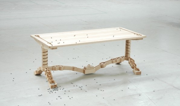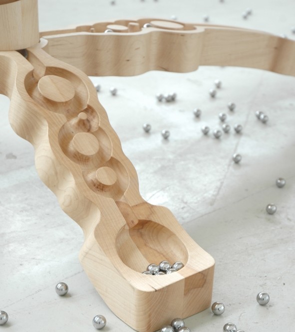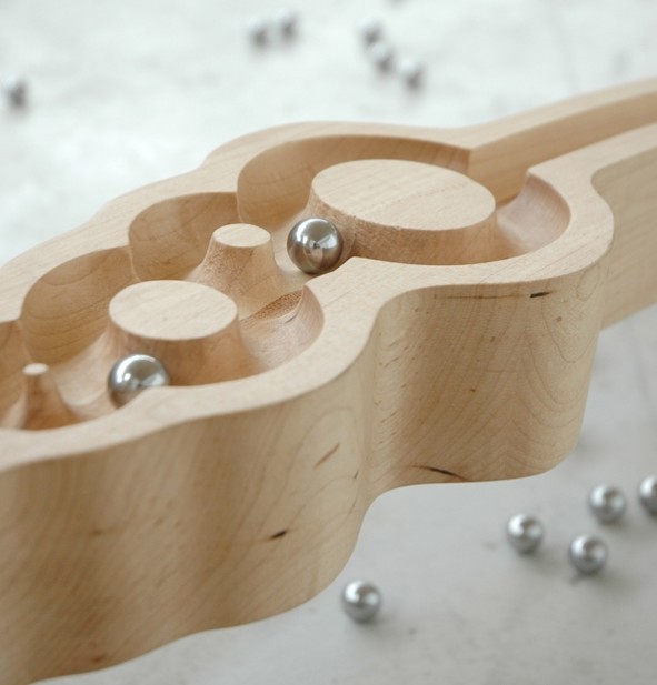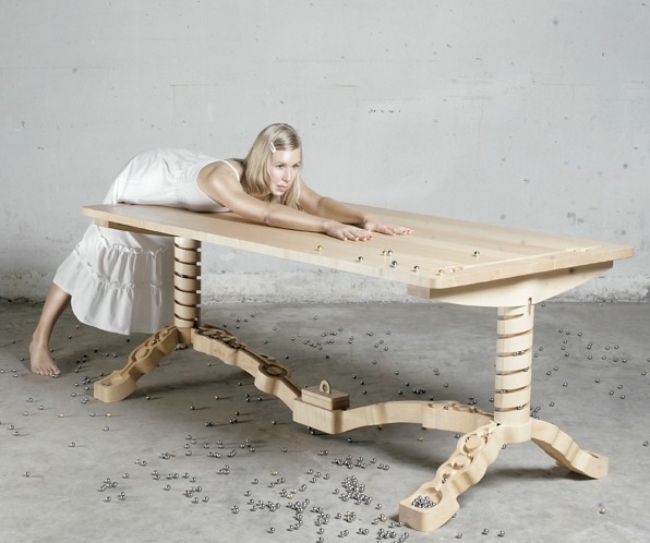 這個美觀大氣的餐桌是由年輕的荷蘭設(shè)計二人組NathaWierink和Tinekeeunders共同為著名品牌Ontwerpduo完成的杰作。這個木質(zhì)的餐桌名為“Marbelous”,餐桌上有蜿蜒的軌道,這樣彈珠就可以順著這些軌道一種從桌面上到達地面。正是由于這樣的設(shè)計,這個餐桌有兩個主要的用途:一是當一個普通的餐桌;二是當作一個絕佳的放松工具,因為看著彈珠一路從桌面順著餐桌的腿跑到地面上,無疑是一個絕佳的放松機會。
