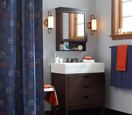 以簡潔的白色為主,只用一條天藍色的條紋圍邊,用藍色的墻漆、毛巾等增加衛(wèi)浴間的藍色元素,使得浴簾成為整體配色的呼應(yīng)。利用海軍制服搭配原理的衛(wèi)浴間,將白色和藍色協(xié)調(diào)的融合在空間里,一抹清新的藍色圍邊,讓浴簾顯得淡雅宜人。