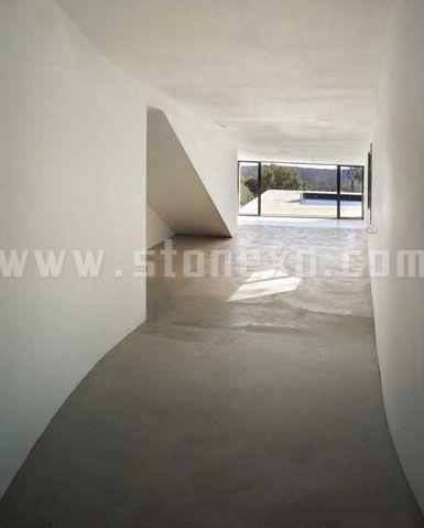 因此,這座房屋是彎曲的,能夠?qū)崿F(xiàn)最好的視野效果。兩條路徑一條向下走,一條向上走。長(zhǎng)的一邊的房屋和蜿蜒的姿態(tài)以及坡道和足夠大的半徑都為居住者提供了全景視野;而短的一邊的房屋通過(guò)一條直線迅速可達(dá),能夠更深入地觀看景致。