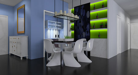 在設(shè)計上突出之處是燈光的設(shè)計與燈飾選擇。在家居設(shè)計中燈光的運用非常靈活。光與影的營造下,家居增添上一份迷人的氣氛。餐廳的一角采用明亮燈飾,氣氛活躍。而客廳則以大小不一的射燈為主,令客廳環(huán)境顯得安詳而幽雅。燈光不僅是用于照明,同時也是家居的配角。俗話說,紅花也要綠葉扶。此方案中選用的臺燈燈座設(shè)計古樸大方,與整個家居裝飾風(fēng)格一致。