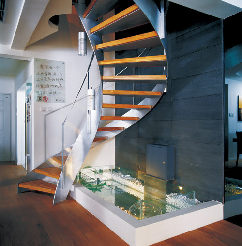 螺旋樓梯帶來空間的通透感,背景墻壁采用與起居室電視墻一樣的材質,
