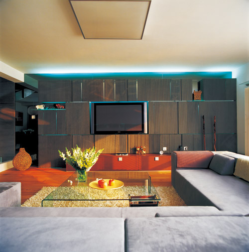 富有動感的電視墻采用建筑石材,光線從石板間放射出來,