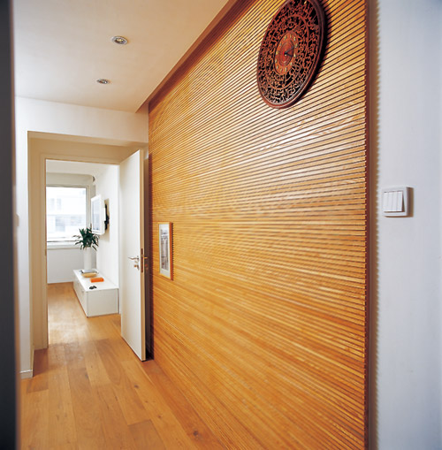 “我不喜歡沒有用的裝飾。”找遍王泉的家,看不到任何炫耀性符號,一切樸素而低調,幾何美感與純粹美學支配著這個家的視覺呈現(xiàn)。直線條體現(xiàn)在裝飾面板的豎線和百葉窗的橫線中,間有立燈的弧線調劑。色調以白色為主,兼有冷色調的青色與溫暖的原木色。建筑師將許多建筑材料運用于室內。王泉說他不喜歡室內室外兩重天,也不喜歡特別室內的材料。因此,石材、陽光板、水泥、紙與木大量運用在設計中,“我喜歡它們真實的質感。”王泉說。