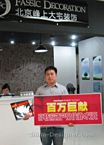 今天,記者來到位于北京的峰上大宅裝飾公司,主要的任務(wù)就是為“亨特百萬巨獻(xiàn)尋找光影大使”活動(dòng)第二輪抽獎(jiǎng)的中獎(jiǎng)幸運(yùn)兒于洋設(shè)計(jì)師帶來價(jià)值4萬大元的亨特窗飾獎(jiǎng)品,當(dāng)然也乘此良機(jī),采訪一下這位“光影大使”的獲獎(jiǎng)感受。