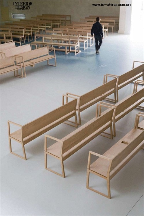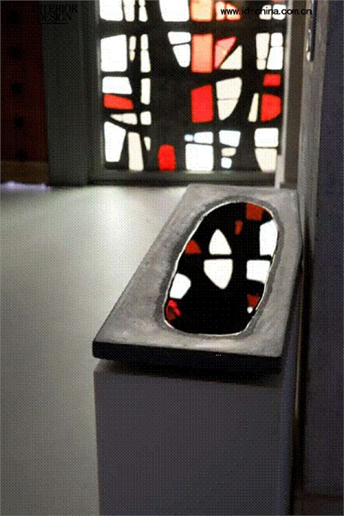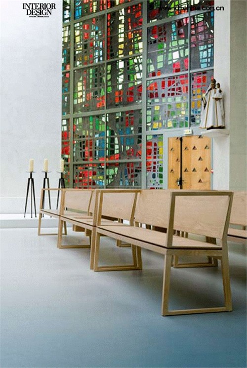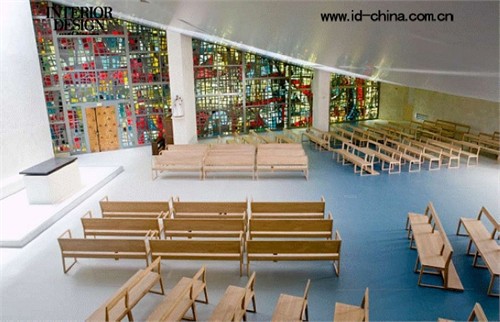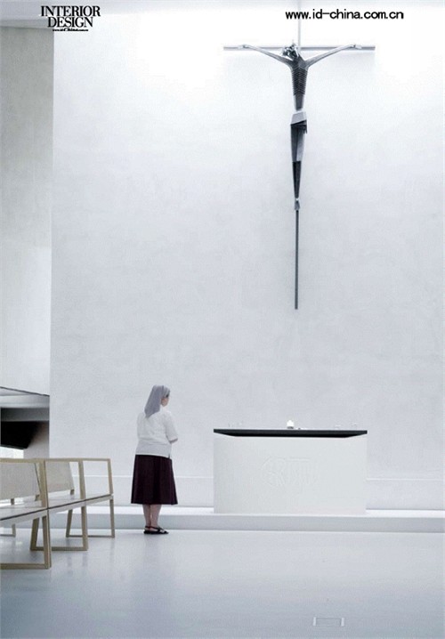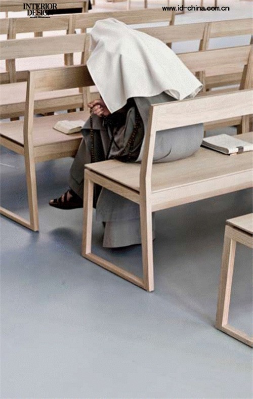 天主教徒多注重禮儀生活,閱讀、默想、誦經(jīng)是他們每天生活的重要部分。因此設(shè)計師在教堂室內(nèi)家具設(shè)計中更考慮到了人性的關(guān)懷。室內(nèi)所有的座椅都采用歐洲盛產(chǎn)的橡木,簡潔的山形木紋、良好的觸摸質(zhì)感、柔和的色彩,將自然的氣息帶入了建筑內(nèi)部,更拉近了“神”與人的距離。家具的組織形式分為幾個不同的模塊:教堂的中心為牧師的講臺,講臺與圣臺和入口在一條軸線上,兩側(cè)分別擺放著一組相互面對的長椅,這是修女誦經(jīng)、唱詩的地方,周邊則是社會教徒落座位置。這種別致的座位擺放不但擺脫了以往固定的模式,其疏密有致的空間分配在安全消防方面也起到一定的作用。正如柯布西耶對建筑的定義:“饒有趣味地利用光照組合空間。”John Doe則在小教堂的室內(nèi)改造設(shè)計中,巧妙地結(jié)合光照組合空間,同時將自然中的石與木納入教堂內(nèi)部,使人與自然相互融合,達到了主神、主人、主萬物的境界。