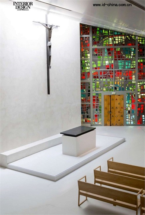設(shè)計師在教堂原有的采光方面做了改進。室內(nèi)所有的明窗設(shè)在“天”與“地”的位置,高與低遙相呼應(yīng),天與地自然相聯(lián),將人世夾與中間。從屋頂天窗射進的陽光將圣臺籠罩在一片燦爛、明朗之中,象征著“神啟”進入信徒的心靈,為禱告者的內(nèi)心帶來了無限的慰藉。如此形勢,恰恰呼應(yīng)了“最高莫若天,最尊莫若主”的神學(xué)思想。每當(dāng)下午,陽光被圣臺兩側(cè)鋼架結(jié)構(gòu)的彩色玻璃窗引入室內(nèi),它并不光彩奪目,只是悄悄地隱在純凈的空間中,顯得溫和而豐富。彩色玻璃窗的設(shè)計增加了空間的情感因素和神秘色調(diào),消除了教堂內(nèi)部大面積黑白色彩所帶來的過度冰冷。