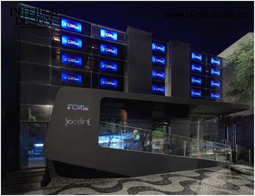 立面是深黑色的。設計師在內側可見的玻璃墻涂布了一層黑銀色的材料,掩飾了玻璃幕墻本來的面貌。內部結構支撐起了室內的所有梁柱與整個立面,而這都多虧了不銹鋼建材的三角形框架。在入口的長廊上,每一塊玻璃都嵌入了LCD面板,從酒吧外能夠看到足足20塊閃爍著的LCD畫面。