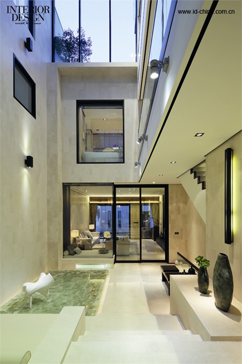 玻璃自其誕生之日起,就與建筑結(jié)下了不解之緣,只要條件允許,人們都愿意更多地在建筑上使用玻璃,伴隨著玻璃從室外——窗戶,走入室內(nèi)——隔斷,玻璃在建筑上的運(yùn)用,特別是在室內(nèi)裝修上的運(yùn)用也有了突破性發(fā)展。在這座別墅中,玻璃儼然成了不可或缺的主角,它不僅扮演了傳統(tǒng)的角色——窗戶和隔斷,同時(shí)還勇敢地嘗試了一個(gè)新角色——墻。幾乎每一處會遮擋視線的墻都被玻璃取代了,這樣做的最顯著效果就是整個(gè)別墅通透了,這種通透除了視覺上的一覽無遺,更重要的是為陽光提供了穿越的條件,讓每一層的每一個(gè)房間都能擁有陽光。