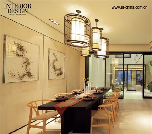 餐廳。黑色的木格柵、鳥籠燈、中式座椅等中式元素與西式的長方餐臺相得益彰。