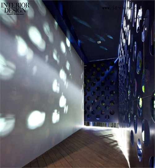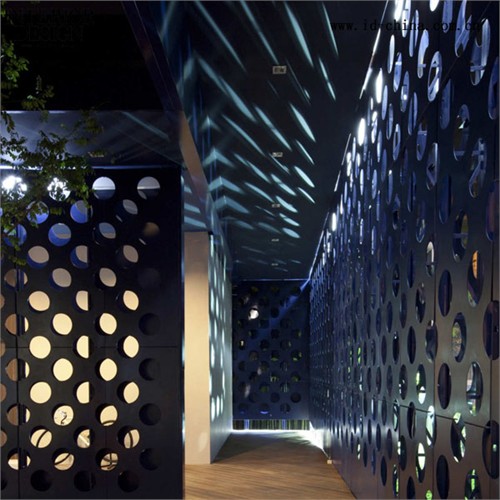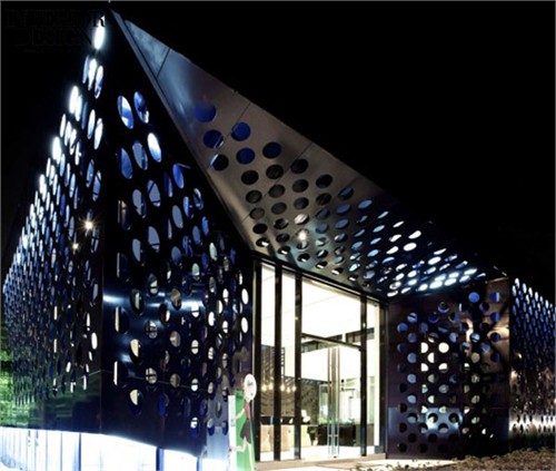 最終設(shè)計(jì)師為它設(shè)計(jì)了一個(gè)雙層表皮,立面上有著許多空洞,像是服裝界流行的波點(diǎn),設(shè)計(jì)師認(rèn)為這個(gè)設(shè)計(jì)就像是主體建筑的面具,因此稱之為“Moire Mask”。該建筑無(wú)論是設(shè)計(jì)還是色彩都相當(dāng)?shù)某錾?,透明的孔洞不時(shí)地透露出室內(nèi)的樣子。當(dāng)顧客或者是路人路過(guò)的時(shí)候,它的面貌會(huì)隨著人們的移動(dòng)而產(chǎn)生變化。也正是由于建筑外立面的特殊性,每天隨著外界自然光線的變幻,它的樣子也不盡相同。而當(dāng)夜幕降臨的時(shí)候它則完全變成了另外一副樣子,與白天大相徑庭。 在光線的變化下暗藍(lán)色的“Moire Mask”似乎也被賦予了生命,室內(nèi)的庭院設(shè)計(jì)也相當(dāng)?shù)某霾剩臻g的分隔別具匠心,進(jìn)入室內(nèi)游走于各個(gè)空間之中,每一處都能讓人感覺(jué)到本設(shè)計(jì)的趣味性。
