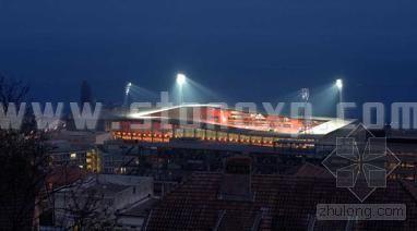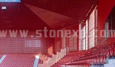 為了展現(xiàn)建筑中的不同功能,外墻是透明的,基座立面用玻璃和不銹鋼建造,反射出周圍的景觀。上層的立面用半透明交織金屬網(wǎng)建造,方便觀眾從體育場內(nèi)往外看。這座體育場很像是一座意大利風(fēng)格的劇場,以紅色和黑色為主色調(diào),更具有娛樂性。