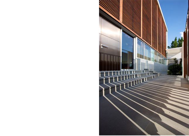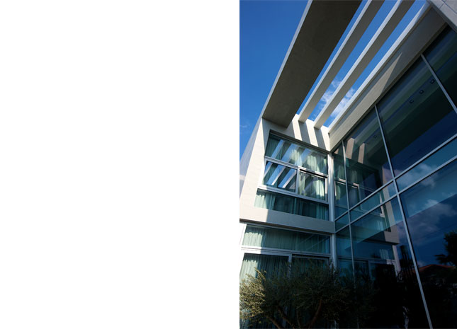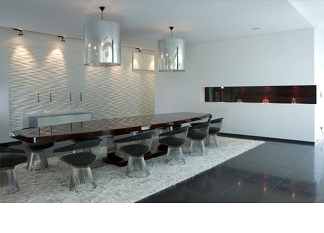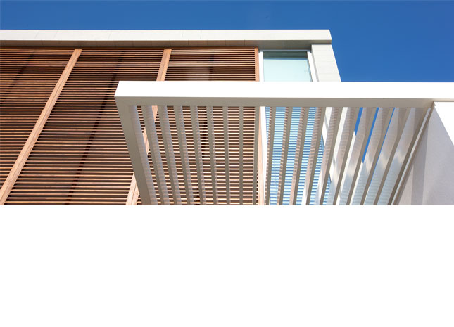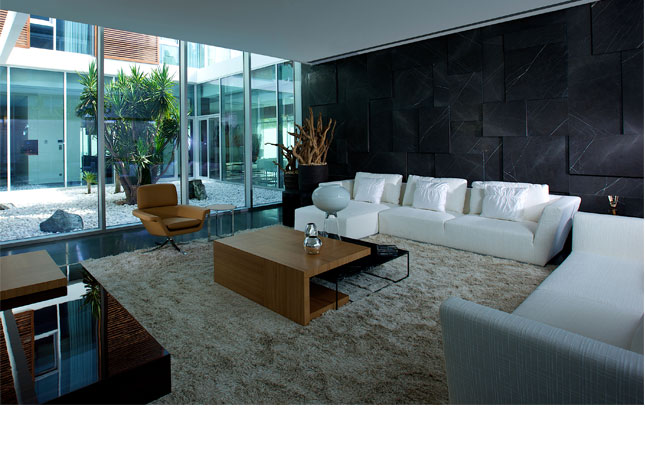 由于別墅自身獨(dú)特的建筑構(gòu)形,其室內(nèi)設(shè)計(jì)風(fēng)格很大程度上以建筑外立面設(shè)計(jì)概念為導(dǎo)向,特別是內(nèi)部的中庭構(gòu)型對(duì)室內(nèi)采光的影響。于是,借由中庭的棚架、屋頂?shù)恼陉?yáng)板,以及露臺(tái),我們能夠明顯感受到設(shè)計(jì)師為住宅主人精心設(shè)計(jì)地室內(nèi)光影游弋變幻的視覺(jué)享受。 別墅正面大塊的落地玻璃,也對(duì)室內(nèi)采光起到重要作用,同時(shí),位于底樓的躍層樓梯保證了室內(nèi)空間的私密性,阻住來(lái)自室外的唐突視線。除了采光方面的作用,別墅內(nèi)部的中庭,還是主人家公共生活的核心區(qū)域,雖然是戶外空間,它卻起到連接別墅兩個(gè)相對(duì)獨(dú)立居住空間的橋梁作用。 |