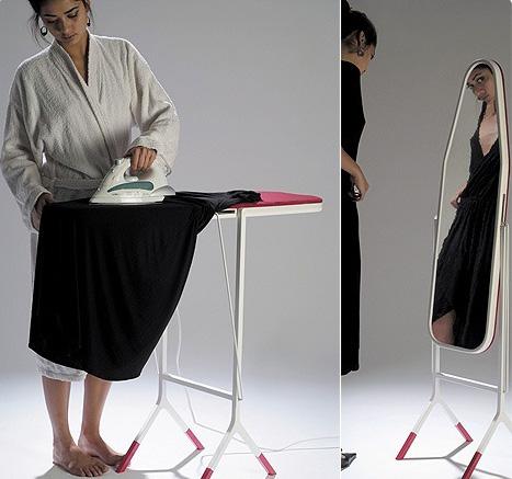 下面的穿衣鏡和熨衣板轉(zhuǎn)換的設(shè)計(jì),異曲同工,同樣是一物兩用。