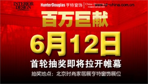 第一輪抽獎將于6月12日在中國(北京)國際時尚家居裝飾展亨特窗飾展位現(xiàn)場熱力引爆,歡迎廣大設計師和消費者到現(xiàn)場見證這一時刻。