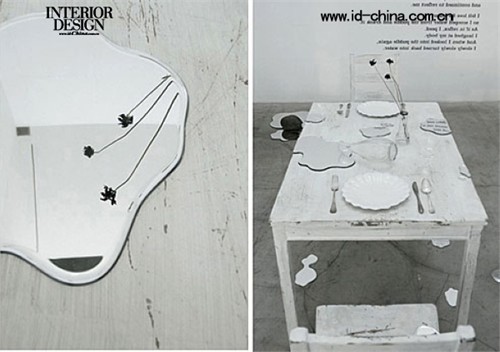 湖面如鏡――之所以有這樣的比喻,是因為水之靜謐與鏡之晶瑩有如出一轍的澄澈。日本廣告人Rikako Nagashim與設(shè)計師Hideto Hyoudou巧妙地利用了這一點,來了一次逆向思維,通過鏡子的可塑性來定格水的變化無常。其聯(lián)手打造的“Mizukagami Water Mirror”系列作品,用鏡子布置了一組與水有關(guān)的生活場景。在這里,鏡子是塑像少女泫然的臉龐,也是枯葉與水面的輕吻;微波蕩漾的漣漪;是不小心翻倒的瓶子,沿著桌邊下注不止。所有的“水”,都凝固在滴落的剎那,保有最純凈的一刻。