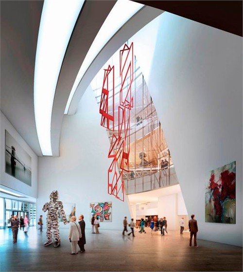 這座博物館將由5000平方米的展廳和7000平方米的花園露臺(tái)組成。室內(nèi)天花板的最低點(diǎn)高5.5米,讓展廳可以展出任何形式和規(guī)格的展品。高8米的中庭可以用來(lái)懸掛特殊的藝術(shù)作品,并促進(jìn)了上層畫廊的空氣流通。規(guī)律排列的室外表皮面板讓室內(nèi)的參觀者可以透過(guò)玻璃幕墻感受到充足的自然光線。細(xì)長(zhǎng)的鋁制鑲板組合成猶如羽翼的遮陽(yáng)罩,避免自然光直接照射進(jìn)展廳內(nèi)。