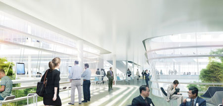 圍繞著"交流、互動(dòng)和創(chuàng)新"的主旨,新的總部建筑將一些公共空間融合在更大的商業(yè)環(huán)境中,頂部樓層可舉辦藝術(shù)展等公共活動(dòng),并可觀賞到美麗的慕尼黑天際線。步行道體系讓人們方便地穿行在辦公樓之間,相互連接的步行橋和廣場(chǎng)等把外部空間變成富有活力的開(kāi)放式聚集場(chǎng)所,員工和當(dāng)?shù)氐木用穸伎稍诖诵菹⒔徽?。?nèi)部設(shè)計(jì)采用了可持續(xù)性元素,符合LEED白金級(jí)的標(biāo)準(zhǔn)。