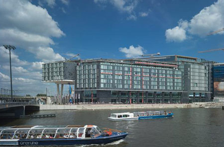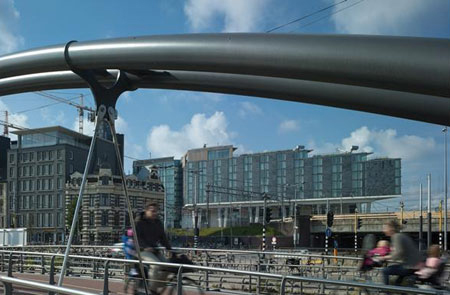 飯店的頂部是一個(gè)空中休閑廳,可俯瞰整個(gè)舊城區(qū)的景色,這在阿姆斯特丹是絕無僅有的觀景位置。飯店用當(dāng)?shù)氐拇u石建造,并以木板和金屬板包面,由三座相連的樓體組成,高度從8層到11層不等。底下兩層是會(huì)議室和餐廳,上面有550間客房。