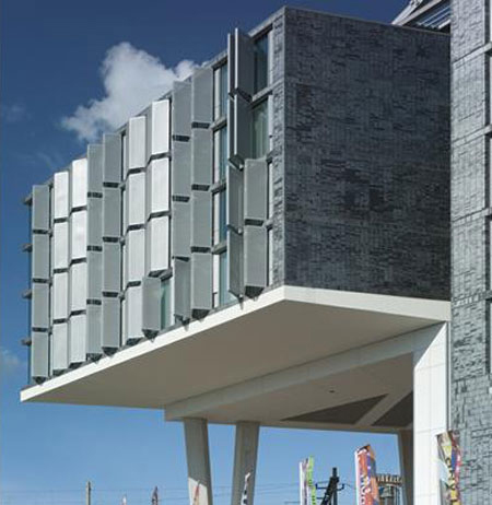 飯店坐落在東碼頭島(Eastern Dock Island),受到地塊幾何形狀的限制,北立面跨越了一條道路,南立面則俯瞰水岸邊的一個(gè)步行區(qū)域,那里設(shè)置了一些咖啡館。