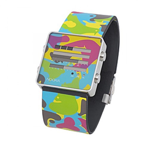 Nooka黑色LED手表,采用熟悉傳統(tǒng)的鐘面,12個(gè)點(diǎn)代表小時(shí),水平線代表分鐘;另外一款采用彩色表身,具有夢(mèng)幻色彩。