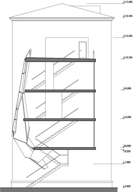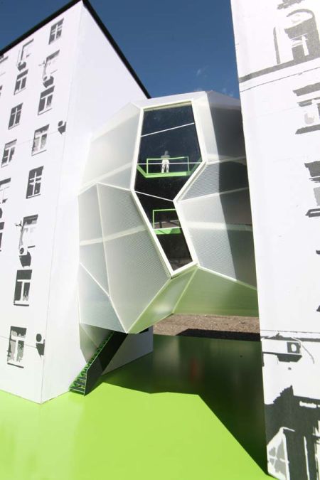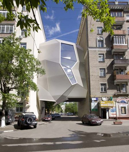 在莫斯科,很多樓房之間的間隔很大,城市空間似乎沒有得到最充分的利用。設(shè)計(jì)師由此得到靈感,使得這間“寄生”在兩棟樓之間的工作室應(yīng)運(yùn)而生。