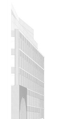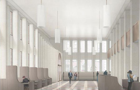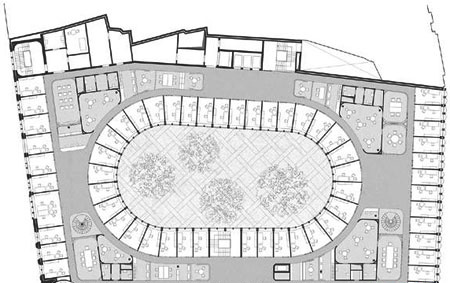 這座7層樓的建筑圍繞著一座橢圓形的庭院建造,被稱作是"城市的一間房"。庭院提供了一條中央軸線,與正立面的臺階形成對稱布局。面朝廣場的高大玻璃窗和雙層高度的護(hù)墻以及拱頂?shù)娜肟冢寂c廣場建筑相得益彰。
