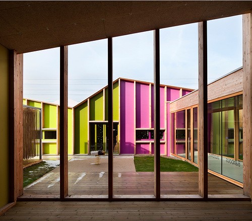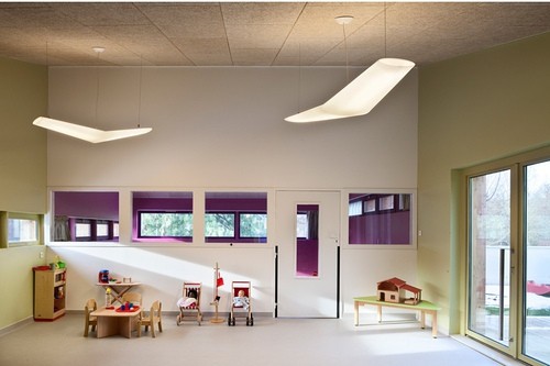 這個(gè)托兒所包括5個(gè)建筑單體,每一個(gè)單體都富有童趣,并且有自己獨(dú)立的場(chǎng)地和入口。對(duì)基地和任務(wù)書的研究之后形成了這個(gè)方案,直接回應(yīng)了項(xiàng)目自身的環(huán)境。設(shè)計(jì)了一組和主要道路垂直布置的房子,避免了對(duì)場(chǎng)地原有植被的破壞。每個(gè)房子都有特別形狀的屋頂,這取決于房間內(nèi)部的功能屬性。這個(gè)房子很特別的地方是木頭的使用,除了建筑室外采用的木結(jié)構(gòu)框架外,在室內(nèi)也采用了特殊的木纖維刨花板,即提供了溫馨的木屋感覺,同時(shí)確保了室內(nèi)優(yōu)良的聲學(xué)性能。