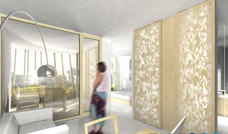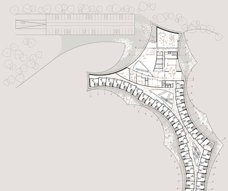 彎曲布局的飯店被分割為較小的部分,這樣客人最多只能看到一到兩個部分。這種凹形的設計保證了客人的私密,不會產(chǎn)生交叉的視線。