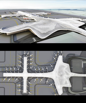 記者了解到,T3航站樓是現(xiàn)有A、B候機(jī)樓面積的三倍,由航站主樓、十字指廊候機(jī)廳、遠(yuǎn)期衛(wèi)星指廊三個(gè)部分組成。其南北總長(zhǎng)度為1050米,東西方向總長(zhǎng)度為600米。指廊寬度為44米,主樓寬度650米。指廊高度24~28米,主樓高度48.6米。