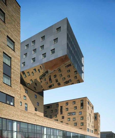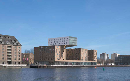 酒店的結(jié)構(gòu)和立面看上去有一個大塊的懸垂結(jié)構(gòu),好似吊車的駕駛艙。立面的表層采用棕色的石塊,對應(yīng)了原來的重要港口Osthafen的風(fēng)格。酒店分為兩座樓,開放式的U形樓身連接著水域,并以玻璃結(jié)構(gòu)連接。西邊的樓頂部是一個分隔的四層樓,可俯瞰河岸,那里的套房能夠上到屋頂平臺以及一座音樂工作室。其懸垂在70英尺處,距離水面則有80英尺。