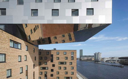 臨街的一面有落地玻璃窗,將酒店與附近的老倉庫區(qū)分開來。穿孔的磚墻和不規(guī)則分布的方形窗戶界定了玻璃窗上方的立面。磚石的顏色并不統(tǒng)一,形成了視覺上不規(guī)則的表層。7層至10層的酒店覆蓋了高度反射性的鋁板,而西南向的立面則通過玻璃雙層里面形成一覽無遺的視野。