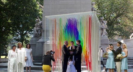 10天里有近60家設(shè)計公司提交了紐約"臨時結(jié)婚教堂"的設(shè)計方案,這是為了紀(jì)念紐約同性戀結(jié)婚合法化而舉辦的競賽。