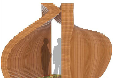 此次競賽的獲勝者將得到3000美元的獎金。Z-A工作室設(shè)計的"吻"(Ki)是用再生的紙板在膠合板的基礎(chǔ)上搭建成層疊的波浪形。ICRAVE事務(wù)所設(shè)計的"彈起"(Pop up)如同絲帶"瀑布",金屬框架上覆蓋著白色的絲帶,而天花板的金屬網(wǎng)上則懸掛著各種長度的彩帶。