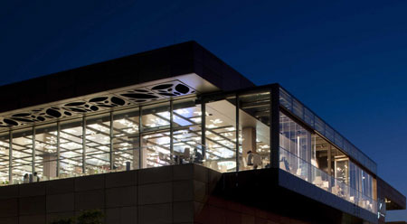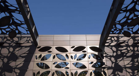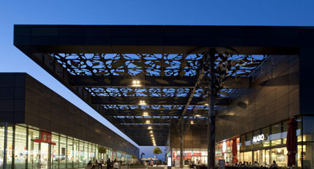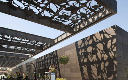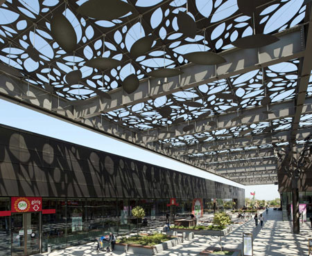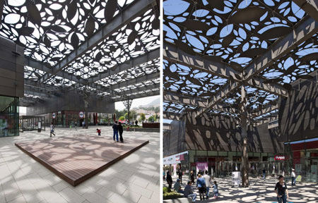 購物中心與街道相連,顧客可在戶外涼亭里休息。傳統(tǒng)的露臺以及建筑的邊緣頂部都種植了常青藤。半覆蓋的空間用金屬網(wǎng)格建造,屋頂上的圖案是樹葉和常青藤,看上去也如同涼亭的造型。涼棚處漏下的陽光在地面上印出了如同葡萄藤上的葉片的形狀。這種融合了傳統(tǒng)與現(xiàn)代風(fēng)格的設(shè)計手法拉近了與顧客之間的關(guān)系。