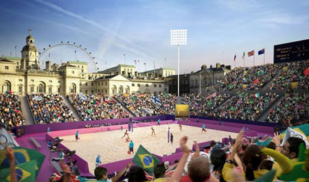 Populous事務(wù)所公布了倫敦奧運(yùn)會(huì)沙排館的最新圖片。這座臨時(shí)性的場(chǎng)館能夠容納1.5萬(wàn)人。 沙排館位于唐寧街后面的馬隊(duì)檢閱場(chǎng)(Horse Guards Parade)。8月9日進(jìn)行預(yù)演彩排,參加測(cè)試賽的有來(lái)自美國(guó)、澳大利亞和中國(guó)的沙排隊(duì)伍,他們都在奧運(yùn)會(huì)上取得過(guò)獎(jiǎng)牌。